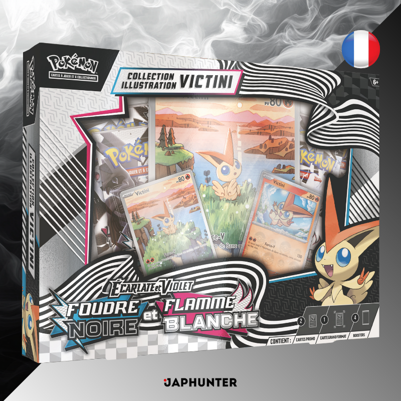 Célébrez la victoire avec style grâce à la Collection d'Illustrations Victini , un coffret premium issu du mini-set Écarlate et Violet – EV10.5 : Foudre Noire et Éclat Blanc . Cette précommande en édition française met en avant l'emblématique Victini avec des cartes promo exclusives, un objet de collection grand format et quatre boosters des dernières sorties.