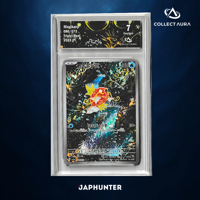 Dive into the world of artistic brilliance with this stunning Magikarp AR (Art Rare) from the Japanese Triplet Beat set, released in 2023. This card features one of the most visually striking designs in modern Pokémon TCG, showcasing Magikarp in a breathtaking underwater scene with cascading waterfalls and dramatic lighting.