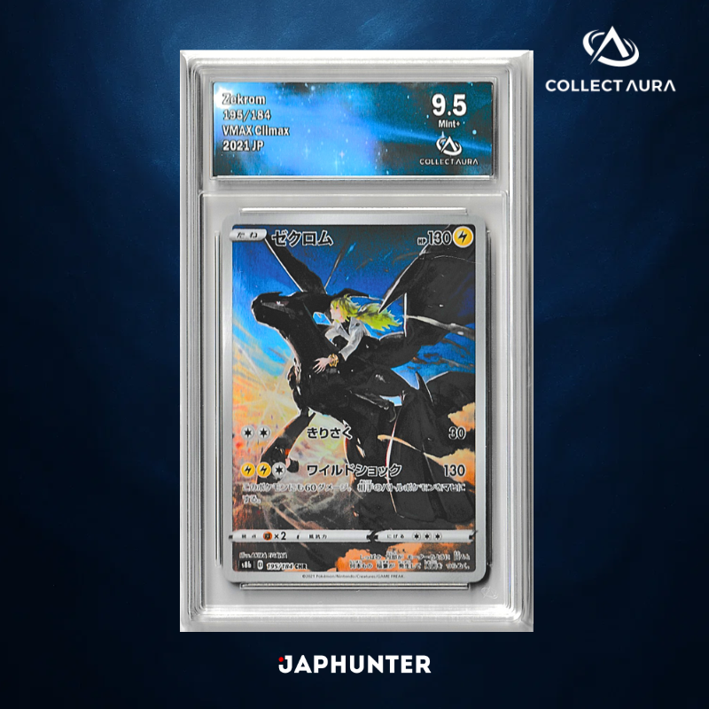 Graded 9.5 Gem Mint by CollectAura, this card is sealed in a crystal-clear slab with a custom blue thunder-themed label, matching the energy of the card itself. Perfect for collectors of Legendary Pokémon, VMAX Climax set fans, or lovers of unique trainer partnerships.